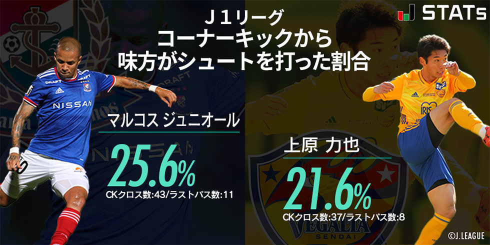 まずは横浜F・マリノス。クロスボールのCKに対してシュートを打った割合は20.2%でリーグ1位であった。注目したい選手はキッカーを担うマルコス ジュニオール。彼が放つキックに対して味方がシュートを打った割合は25.6%。1試合平均4~5回あるCKで1試合に1回はシュートをお膳立てしている計算になる。