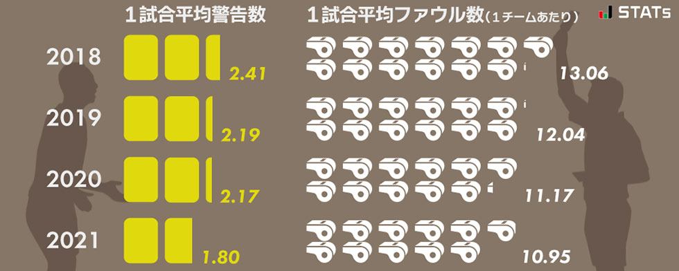 近年、減少傾向が続いていた1試合あたりの平均警告数は、今季もさらに減少。1993年のJリーグ開幕以来、最も警告数が少ないシーズンとなった。また、今季の1チームあたりの1試合平均ファウル数は10.95となり、2018年から減少傾向が続いている。今季から本格導入されたビデオアシスタントレフェリー(VAR)のサポートや審判員のレフェリング技術の向上、レフェリングスタンダード(判定基準)に対する選手たちの理解度の高まりなど、さまざまな変化が重なり合い、Jリーグは「フェアでエキサイティングなリーグ」に近づいているといえるだろう。