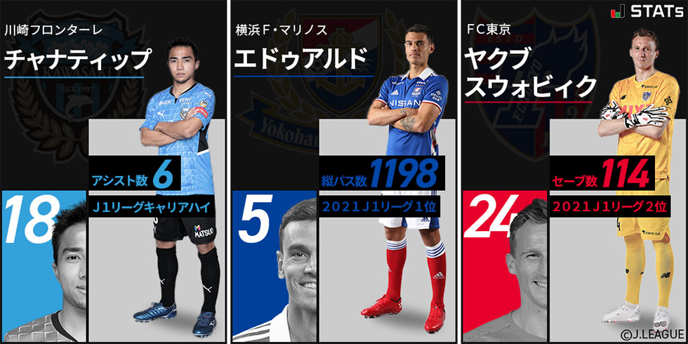 2人目は、2月に入ってサガン鳥栖から横浜F・マリノスへの移籍が発表されたエドゥアルドだ。高い身体能力と的確な読みを駆使して鉄壁を築くだけでなく、技術の高い左足を活かしたビルドアップでも抜群の存在感を発揮する。昨季はクリア数170でJ1リーグ3位タイ、縦パスは1198本でJ1リーグトップ、さらには直接FKゴールも2得点でJ1リーグ1位タイと、多彩さをあらためて見せつけた。新天地でも、攻守において欠かせない存在となりそうだ。