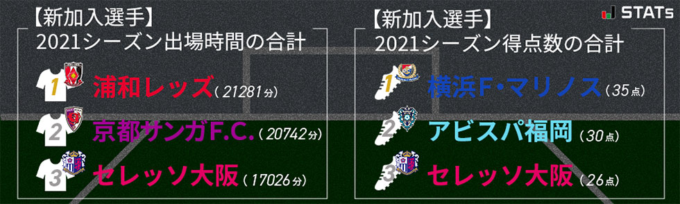 各チームに加わった新戦力が昨季Jリーグの舞台でどれだけの結果を残してきたか。各チームが獲得した新戦力をスタッツから評価するため、ここでは新戦力の「昨季Jリーグ出場時間の合計」と「昨季Jリーグ得点数の合計」を算出した。