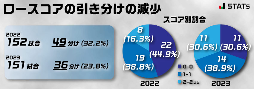 今季の勝敗の傾向として、引き分け試合が昨季よりも減少したことが挙げられる。昨季の引き分けは49試合(32.2%)だったが、今季は36試合(23.8%)まで下がっている。その内訳を詳しく掘り下げてみると、昨季のスコアレスドローが22試合を数える一方、今季は11試合のみとなっている。全体の引き分け数が減っている中で、2-2以上の引き分けは増えていることから、「昨季より得点が入る試合が多く、勝敗がはっきりしている」というのが今季の前半戦を象徴する傾向と言える。