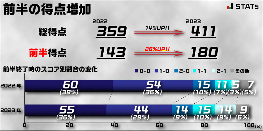 今季、動きのある試合が増えたことを示すデータがもう1つある。それは、「前半の得点の増加」だ。昨季の前半得点数が143であるのに対し、今季は180と1.26倍になっている。これに比例するように、前半終了時で0-0や1-0(ホーム、アウェイは問わない)の試合は15試合減少。代わりに1-1や2-1のように両チームが得点している試合が増えている。得点数38でリーグトップの北海道コンサドーレ札幌は、前半だけでこちらもリーグトップの21得点を挙げており、これは前半得点数2位の横浜F・マリノスの16得点を大きく上回る記録となっている。