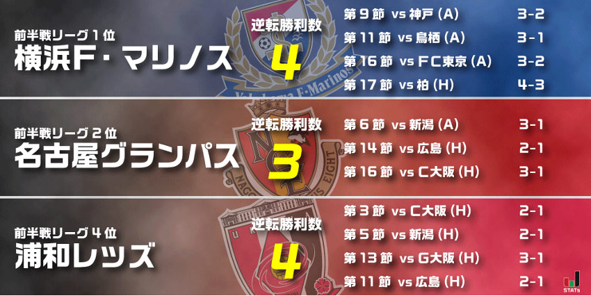 リードしているチームがそのまま勝利するのかというと、そうではないのが今季のJ1の特徴でもある。昨季の逆転勝ち試合数は17である一方、今季は24に伸びている。試合をひっくり返した回数が多いチームは横浜F・マリノス、名古屋グランパス、浦和レッズの3チームと上位陣が並んでいる。リードを奪われてもひっくり返す力を存分に見せつけている。なお、先ほど前半得点数トップとして紹介した北海道コンサドーレ札幌は11試合で先制に成功しているが、そのまま勝点3を積み上げた試合は6試合に留まっており、約半数の試合は逃げ切ることができていない。