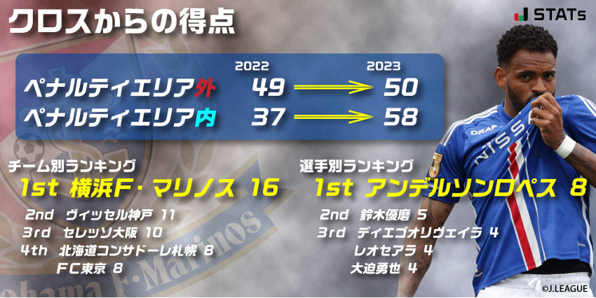 では得点が増加した今季のJ1はどのような得点パターンが多いのか。その1つは「クロスからの得点」である。クロスからの得点は昨季86得点だったが、今季は108得点(1.26倍)になっている。増加分のほとんどがペナルティエリア内からのクロスであり、ペナルティエリア内サイドのいわゆるポケットに進入してからの得点が多いことが今季のトレンドと言える。クロスからの得点が多いチームとしては横浜F・マリノスが16得点でリーグ最多(ペナルティエリア内からも7得点で最多)。得点ランキングトップのアンデルソン ロペスが奪った13得点のうち、8得点はクロスからネットを揺らしたものであり、「アタッキングフットボール」の終着点として絶大な存在感を見せつけている。