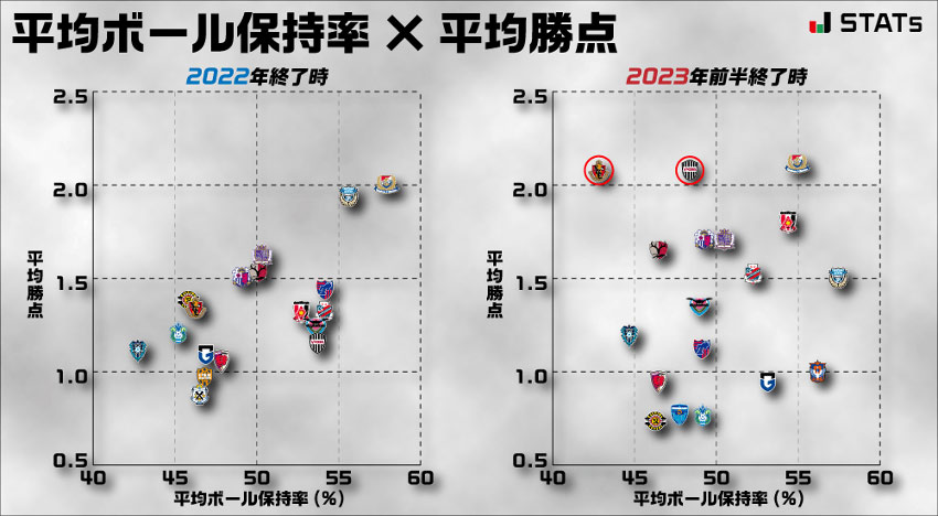 4月のコラムでも紹介したように、ボール保持率が低いチームの上位進出も、今季の特徴の1つである。ボール保持率が45%未満だった試合での勝率を比較すると、昨季の36.6%に対して今季は50.0%まで増加。負け率はそれほど変化していないため、引き分けで終わっていた試合を勝利に結び付けている形となっている。この傾向の象徴ともいえる存在が名古屋グランパスとヴィッセル神戸だ。上図は2022年(シーズン終了後)と2023年(前半戦終了時点)の「各チームの平均ボール保持率と平均勝点」をプロットしたものである。今季の名古屋グランパスとヴィッセル神戸は高い位置でのボール奪取や速攻でゴールを陥れるスタイルで結果を残している。しかし2022年のグラフを見ると、ボール保持率が低くて勝点が多い左上エリアにプロットされるチームは存在していない。さらに、直近10年で平均ボール保持率50%未満のチームがリーグ優勝を果たしたケースは一度もない。ポゼッションスタイルが根付いたJリーグに新たな流れを呼び込むことになるのか、後半戦の両雄に注目したい。