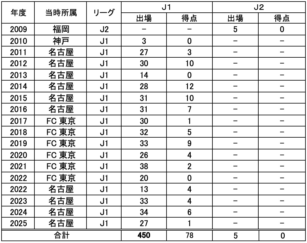 【永井 謙佑 選手 年度別成績】
