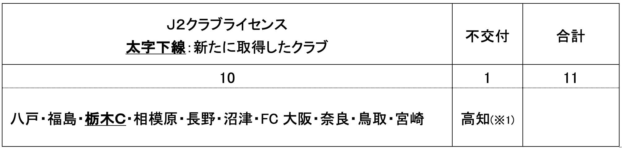 ※1高知ユナイテッドSCは、「選手の育成体制(アカデミーチーム)」が未充足のためJ2クラブライセンス不交付となりました。(J1・J2クラブライセンス交付規則 規則番号S.02参照)