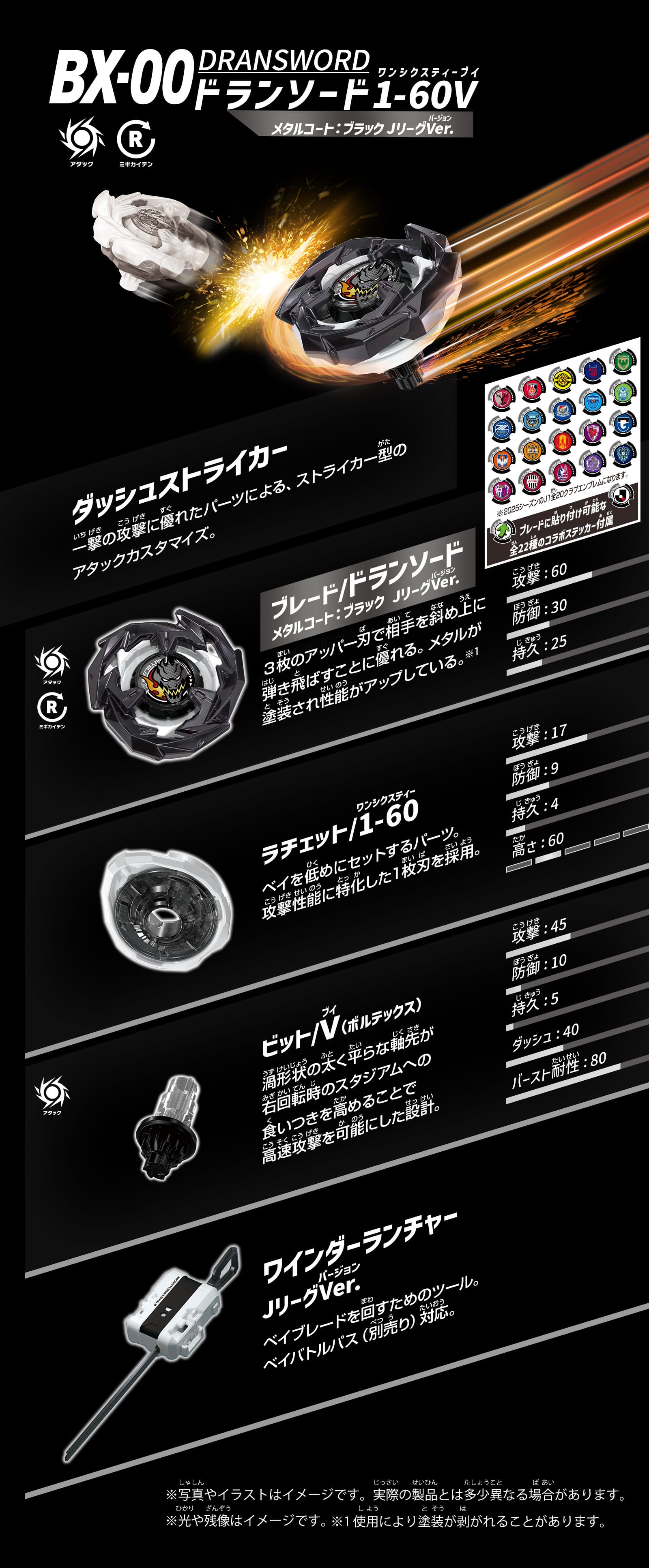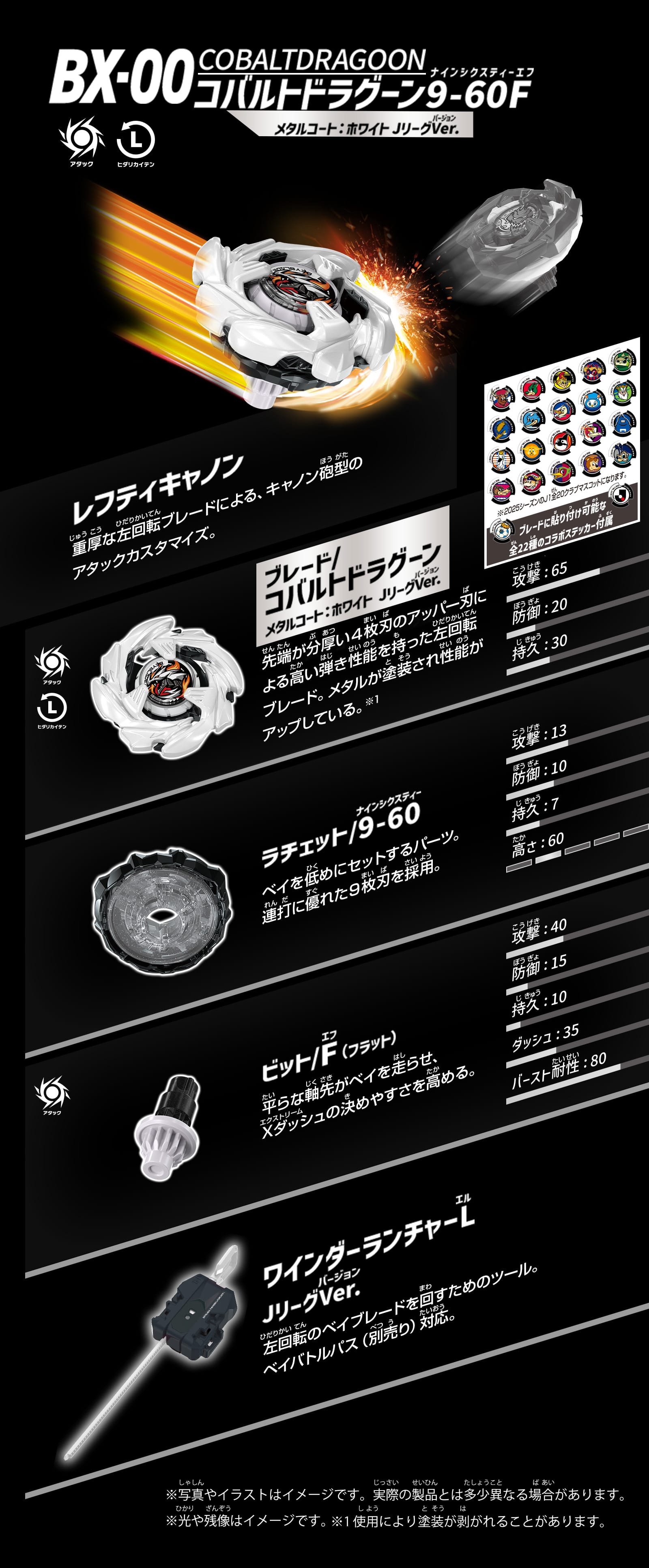 ワインダーランチャー同梱のスターター。一撃の攻撃に優れたパーツによる、ストライカー型のアタックカスタマイズ。Jリーグ&2025シーズンJ1全20クラブのコラボステッカー付属。
