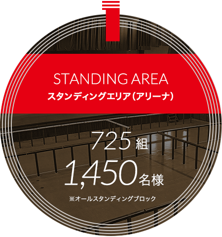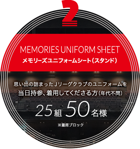 <1>スタンディングエリア(アリーナ)725組1450名様 ※オールスタンディングブロックでのご案内となります <2>メモリーズユニフォームシート(スタンド)25組50名様 思い出の詰まったJクラブのユニフォーム(年代は問いません。ただし、オーセンティックユニフォーム、レプリカユニフォームに限ります)を当日持参、着用してくださる方がご応募いただける席種です。(同伴者様含む) ※着席ブロックでのご案内となります |