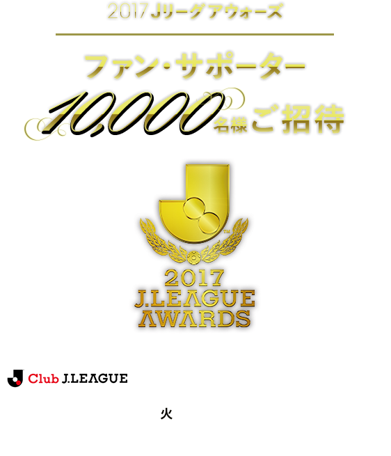 Jリーグは、12月5日(火)横浜アリーナにてJリーグの年間表彰式「2017Jリーグアウォーズ」を開催いたします。今シーズンの締めくくりの場となるこちらの表彰式に、Jリーグ公式アプリ「Club J.LEAGUE」にてご応募頂いた方の中から抽選で10,000名のファン・サポーターの皆様をご招待いたします(入場無料)。