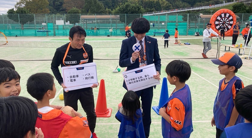 サッカー教室とサステナトークを実施。猛暑、大雨、台風などの異常気象をもたらす気候変動とサッカーの関係を知り、サッカーを通して気候アクションの重要性を理解し、行動変容を促すきっかけとなることを目的として実施しています。