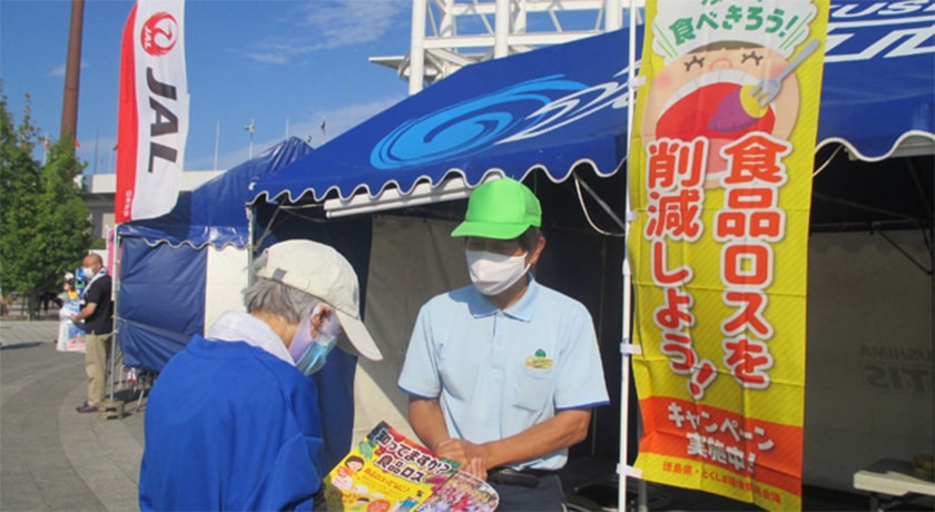 徳島県(エコみらいとくしま)と連携した食品ロス削減啓発ブースにおいて、食品ロスが多く発生している事実を来場者に認識していただくとともに、食品ロスの発生を極力減らしていく手法・工夫等について学んでもらう。