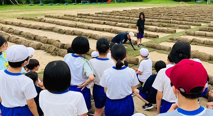地域課題である耕作放棄地を活用しクラブが生産した芝生で小学校校庭の芝生化を行います。芝生化により校庭の気温上昇の抑制やCO₂の吸収、砂塵防止などの効果が期待できます。