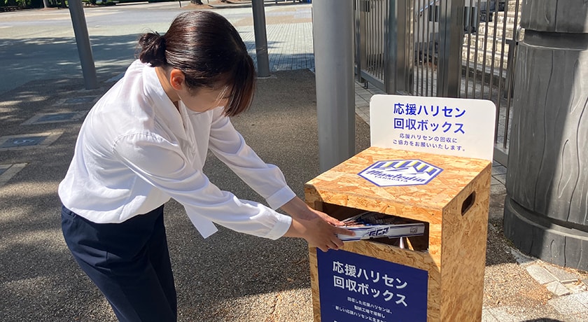 ホームゲームで配布している応援ハリセン。これまでは一部廃棄されていましたが、今後専用回収BOXにて回収し、オザックス社や古紙回収業者様と協力し、再生資源として活用します。回収BOXはスタジアム各ゲートの出口付近に設置しております。