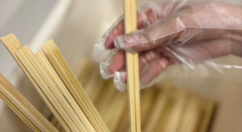 竹林が放置されることで生態系の破壊や土砂災害の原因になるなど、竹害が大きな環境問題となっています。レノファ山口FCでは、竹林整備のために計画的に伐採された竹から作られた「竹箸」の利用促進に取り組んでいます。