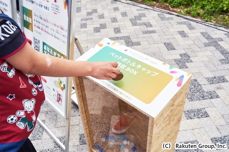 会場内外にはペットボトルキャップの回収ボックスが設置され、ボトルとキャップの分別を促進。キャップ回収業者に納めた売却益は、世界中の子どもにワクチンを提供するための資金として活用