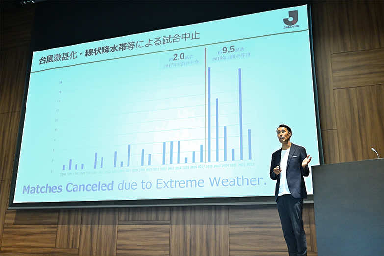 「2018年を境に台風や線状降水帯、大雨による影響で中止になる試合の数が、5倍ぐらいに増えています。それから、暑さですね。もちろんシーズンを移行することである程度の解決が見られると思っているんですが、 今みたいな暑さがさらに進行していくと、シーズンを変えただけでは対応できないのではないかと懸念しています。」