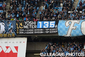 川崎Fで大久保が得点を決めると、スタンドに掲げられた「YOSHI METER」が回転する。