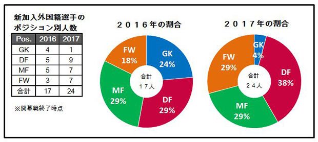 今季初めてJリーガーとして登録されたJ1の外国籍の選手は24名。昨季の同時期と比べると7人多い。ポジション別の内訳は表のようになっており、DFとFWの占める割合が高くなっている。