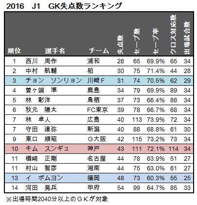まずはGKの3名に関してだが、16年のJ1で2040分以上出場した選手を失点が少ない順に並べてみた。