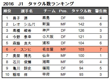 球際で戦う姿勢を見せたのは名古屋グランパスのイ スンヒ。タックル数はリーグでも上位に。激しさの裏返しとして、警告を重ねてしまったのが玉に瑕か(7枚で6位タイ)。また、パス数1188本はチームトップ。攻守において存在感を発揮した。