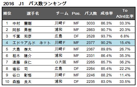 パスサッカーを指向した川崎Fにあって、中村 憲剛、大島 僚太とともに中盤を支えたエドゥアルド ネット。ほかの2人に比べてアタッキングサードへのパス比率が低いという特徴が見られたものの、バランスを取りながら、潤滑油としてチームの歯車を回し続けていた。