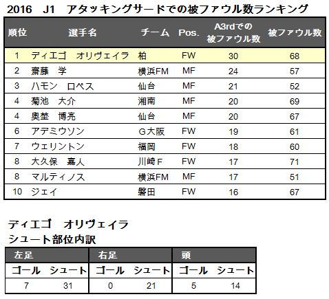 得点ランキング9位タイの12ゴールを挙げた柏レイソルのディエゴ オリヴェイラは、A3rdでの被ファウル数が1位。相手にとっての脅威となり、PK奪取も3度ある。また、右利きにも関わらず、放ったシュートは左足の方が多く、右足でのゴールは0という珍しい数値が。7月の月間ベストゴールに選ばれたシーンをはじめ、左足で印象に残るゴールを多く決めた彼には、一度本当に右利きなのかを尋ねてみたい。