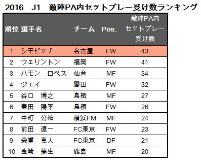 11ゴールをマークした名古屋のシモビッチは、誰の目にも明らかなターゲットとして相手のゴール前で存在感を放った。敵陣ペナルティエリア内でのセットプレー受け数は1位。全エリアでの空中戦数は3位に甘んじたが、飛ばずとも競り勝てるがゆえなのかもしれない。