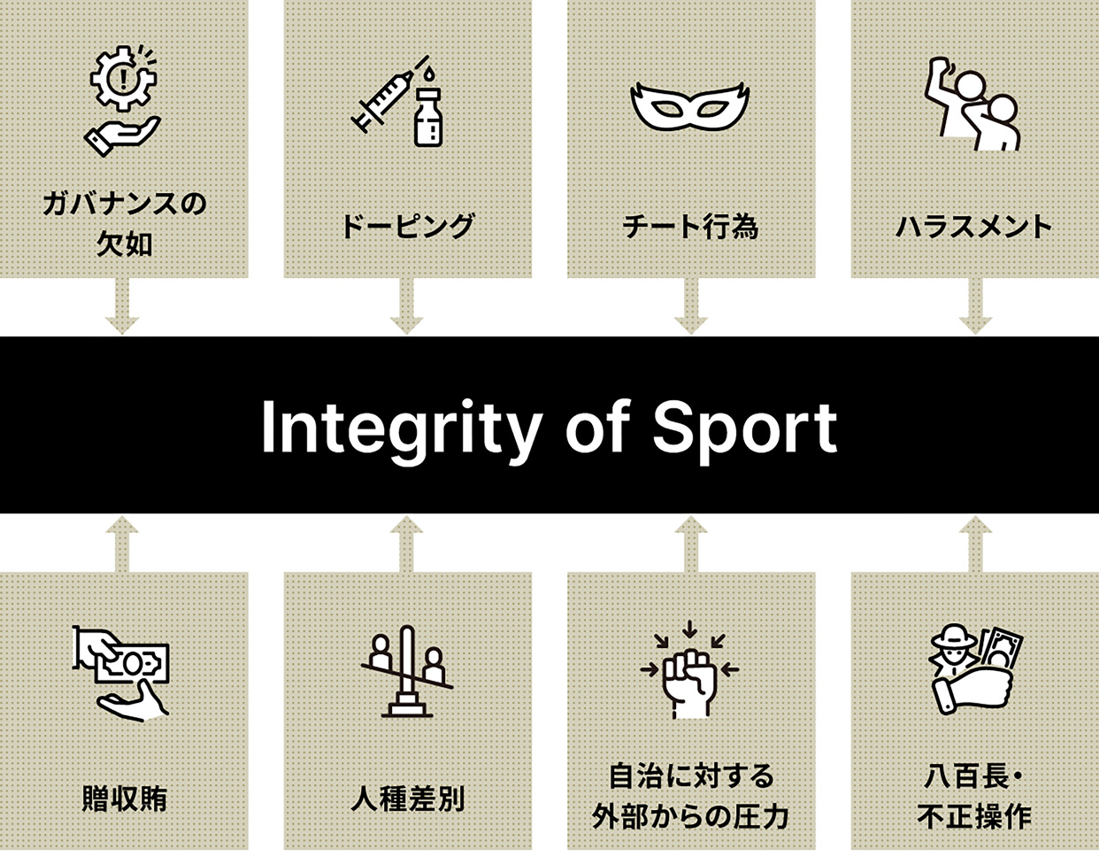 しかし、スポーツ界にはいま、ドーピングや八百長、スポーツ指導における暴力、ハラスメント、ガバナンスの欠如など、「インテグリティ」を脅かす様々な問題があります。