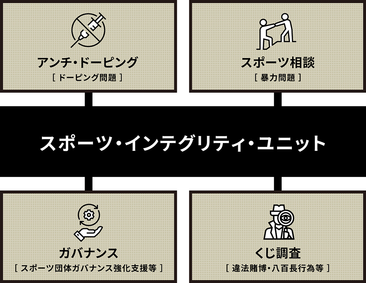 日本ではJSC(日本スポーツ振興センター)が日本における「Integrity of Sport」の保護・強化を目指し、2014年に「スポーツ・インテグリティ・ユニット」を設置し、この取組を推進しています。