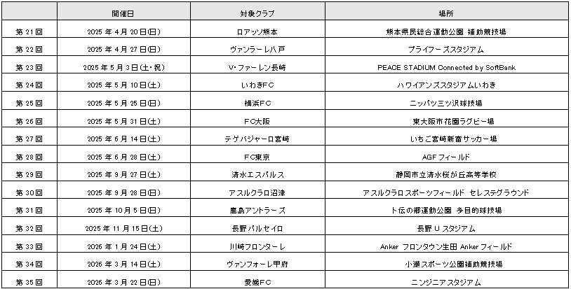 2026年度は、4月12日(日)鹿児島ユナイテッドFC(白波スタジアム)を皮切りに、全15回を開催予定。Jリーグ60クラブの拠点を優先的に、47都道府県での開催を目指しております。