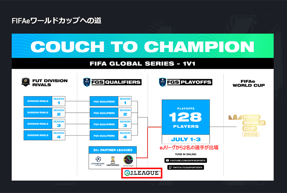 「FIFA 22 グローバルシリーズ eJリーグ」は、エレクトロニック・アーツ社(以下EA)のゲーム「EA SPORTS FIFA 22」を使用して実施する大会で、Jリーグモードを使用した『クラブチャンピオンカップ』とFIFA eWORLD CUPのルールに則った『FUTチャンピオンカップ』の2段階で大会を開催いたします。『FUTチャンピオンカップ』の優勝者および準優勝者には、国際サッカー連盟(FIFA)が主催する公式eスポーツ大会「FIFA eWORLD CUP」の予選であるFIFA 22 グローバルシリーズプレーオフへの出場権が与えられます。