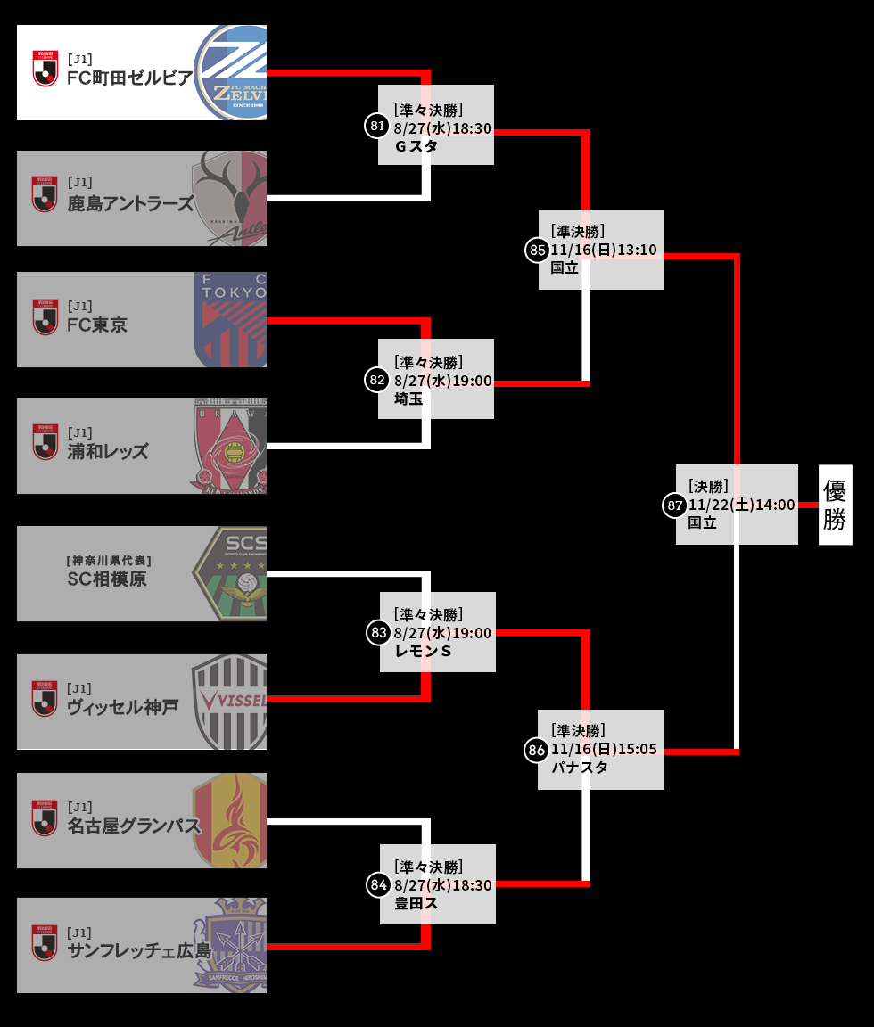 更新情報 2025/11/22(土)NEW!! ニュース 神戸を下した町田が悲願の初優勝!クラブ史上初となるタイトルを獲得【サマリー:決勝】 天皇杯の決勝が22日に国立競技場で行われ、神戸を下した町田が初優勝を飾った。 2025/11/16(日) ニュース 激闘を制した町田と神戸が決勝進出!決勝は11月22日国立競技場で開催【サマリー:準決勝】 2025/8/27(水) ニュース 3発快勝の町田が鹿島を撃破!神戸は相模原とのPK戦を制し準決勝進出【サマリー:準々決勝】 ページの先頭へ戻る トーナメント表 ページの先頭へ戻る Tweet