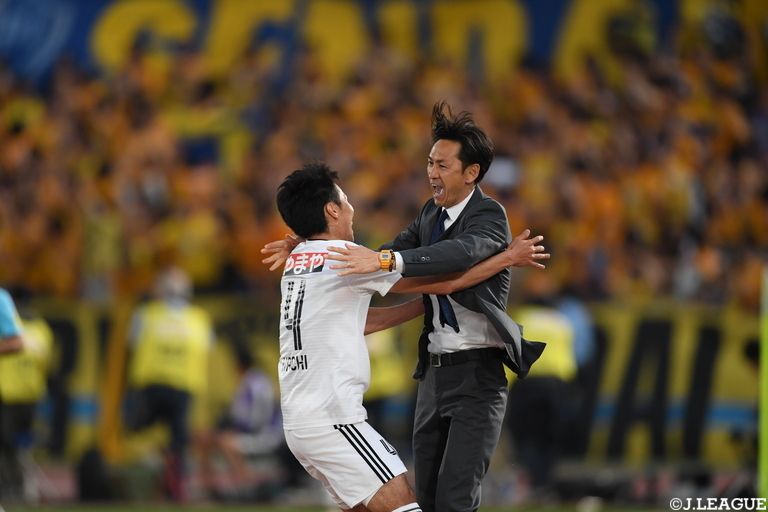 仙台の渡邉 晋監督と蜂須賀 孝治選手が歓喜の抱擁!