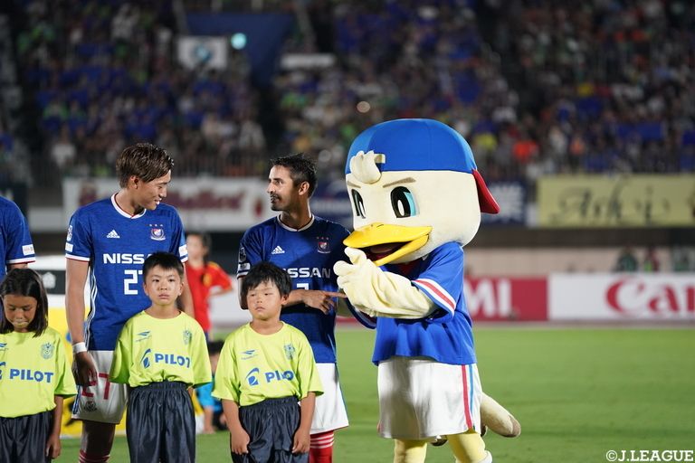 松原 健選手、ウーゴ ヴィエイラ選手、そしてマリノスケ。