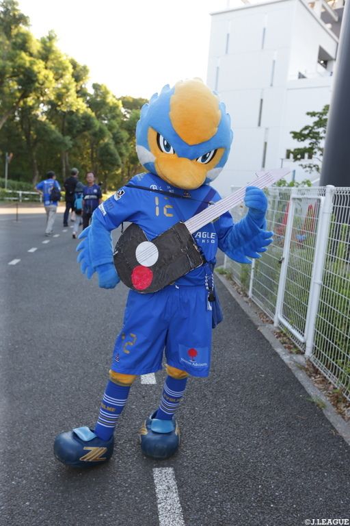 この試合、Jリーグのオフィシャルテーマソングである「J'S THEME」を弾く春畑 道哉さんが来場するということで、特製のギターを持つゼルビー!