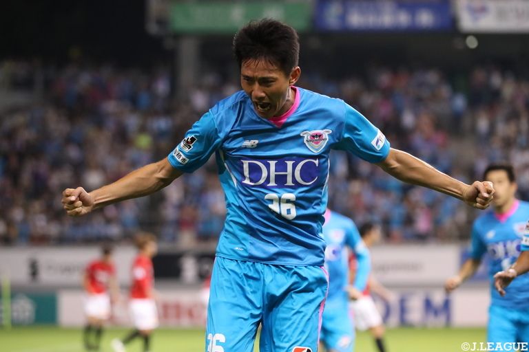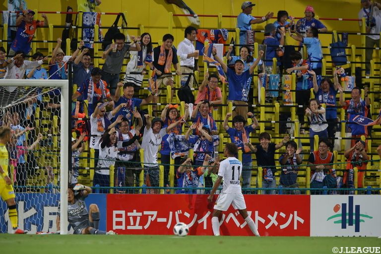 ゴールを決め、アウェイの地に駆けつけたサポーターとともに喜びを爆発させる鈴木 武蔵選手!