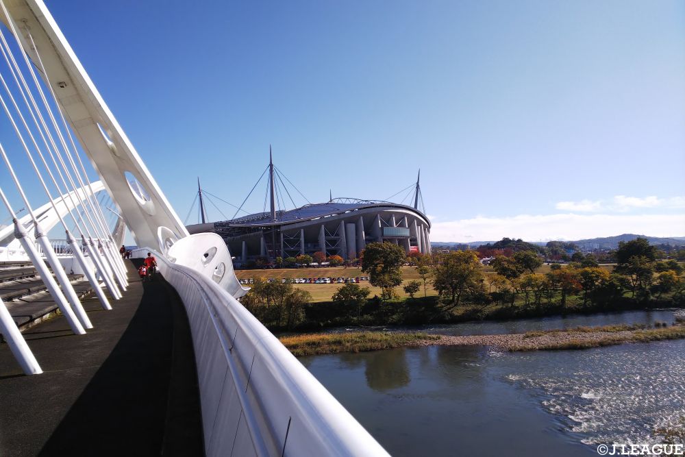 川のほとりに立つ豊田スタジアム。