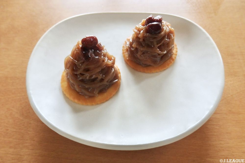 ルヴァンプライムの中央に生クリームを絞ったら、生クリームの周りにマロンクリームを絞り、ゆであずきをトッピングすれば出来上がり!!
