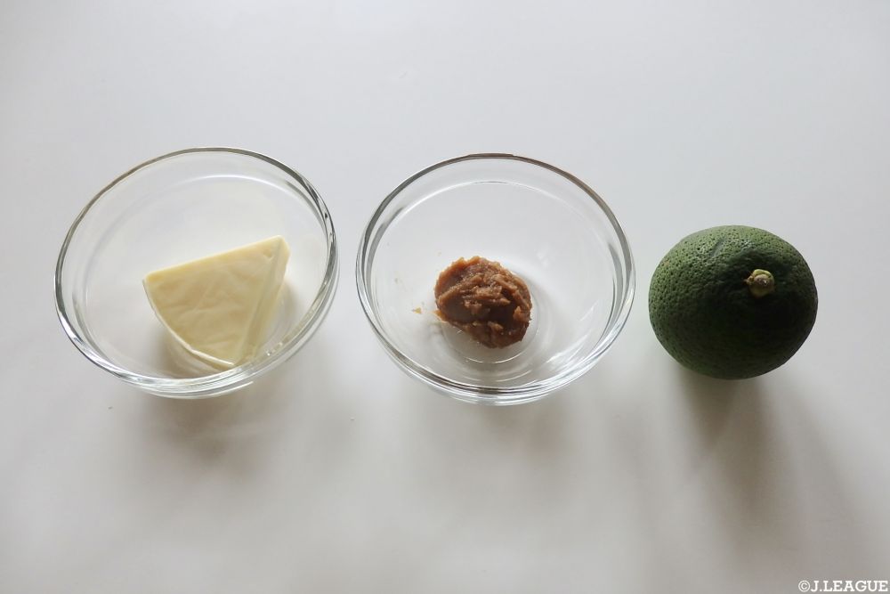 レシピの材料には「かぼすみそ、カマンベールチーズ(三角チーズ)、かぼす」とありますが、かぼすみそを手に入れることができず・・・ひとまずかぼすとみそと三角チーズを用意しました。