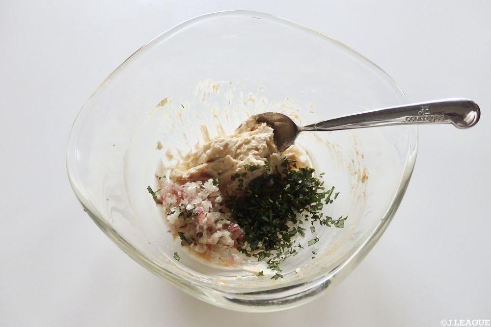 クリームチーズと味噌・白ごまを混ぜたら、みじん切りにしたみょうがと大葉を加えてさらに混ぜたものをルヴァンプライムに塗ります。