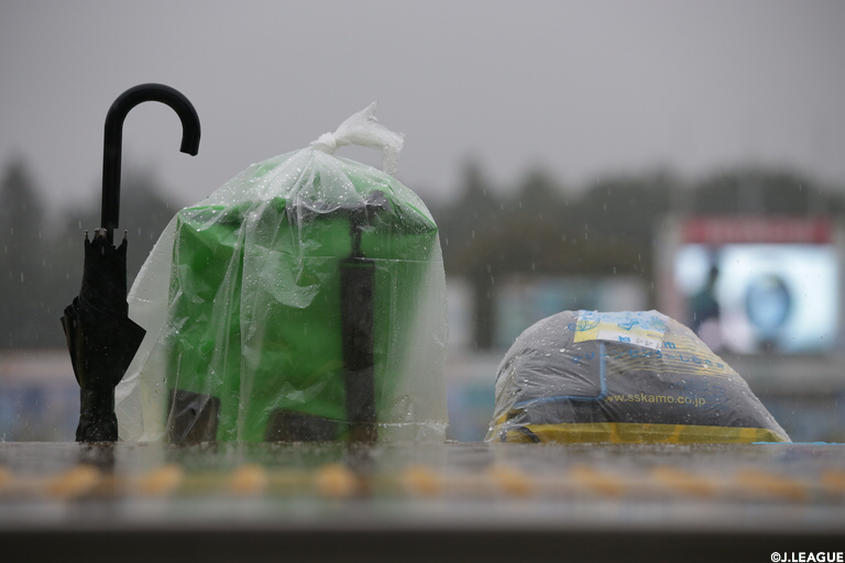 「試合中スタジアム内で傘をさせないと、びしょびしょになっちゃうのでは…!?」