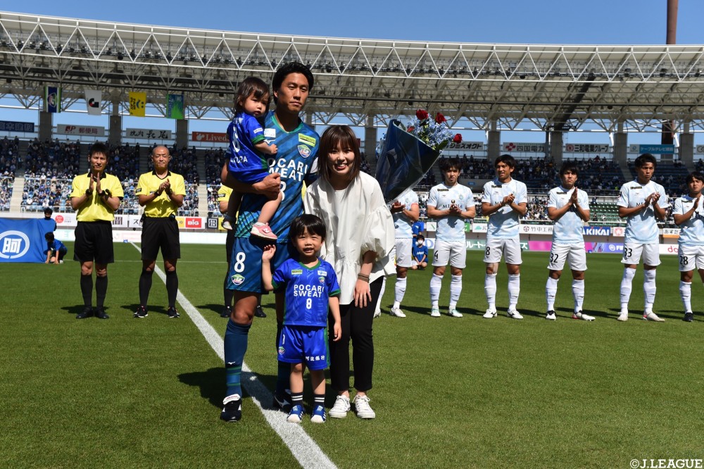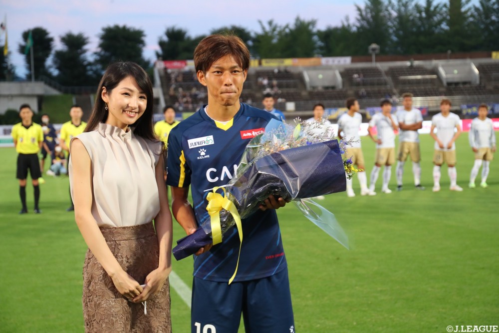 4月にJリーグ通算150試合出場を達成した北爪選手。チームメイトから花束が贈られました。