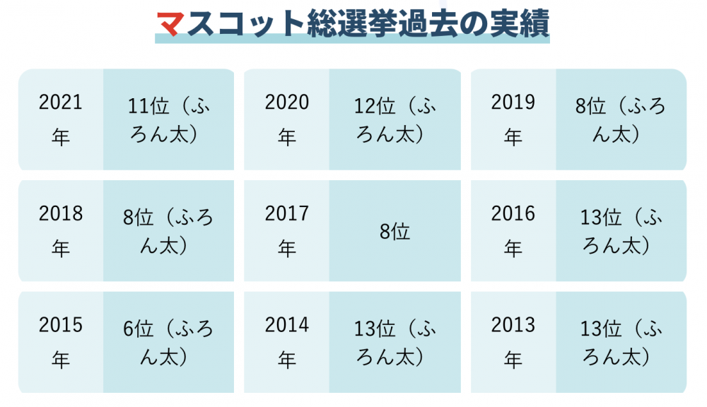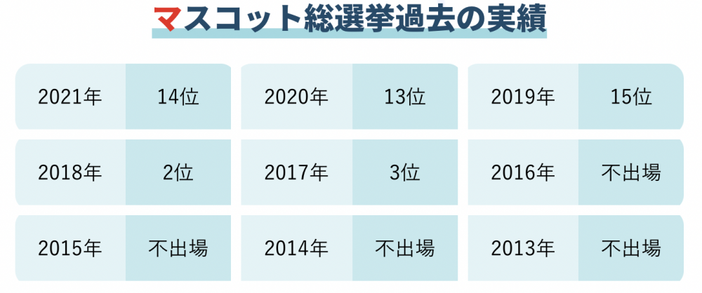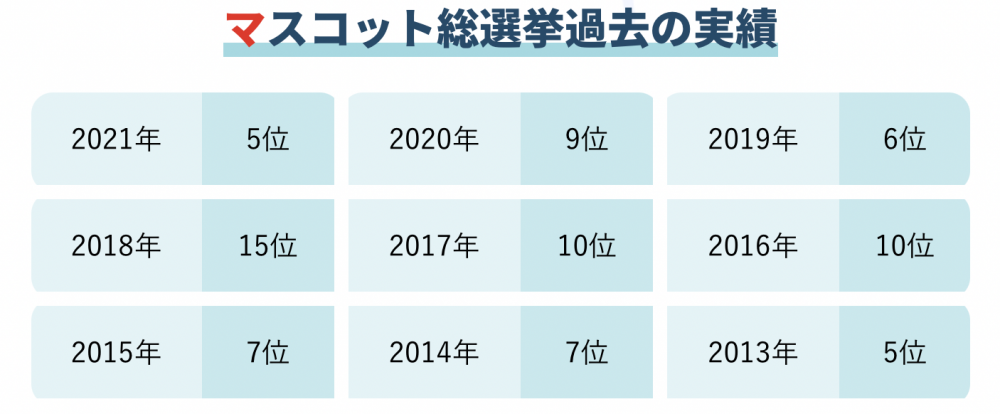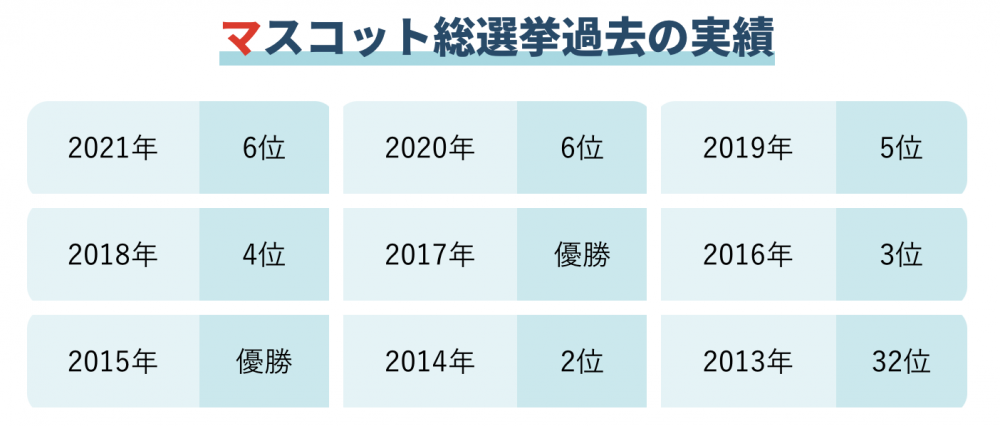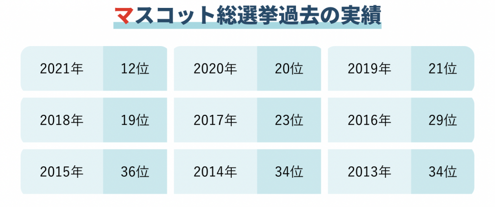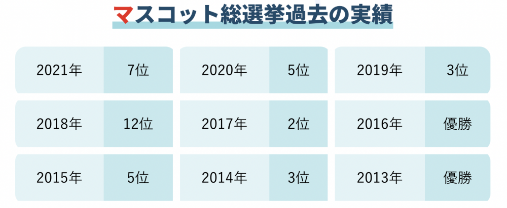 上位陣ばかりではなく、この10年の歴史の中で、順位変動からマスコットに注目してみました!