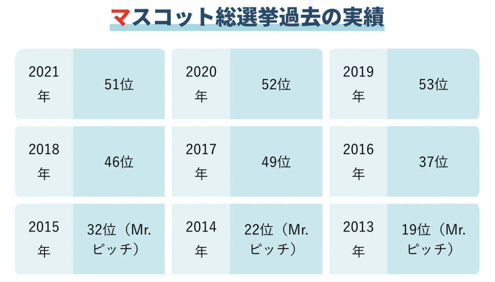 初登場の2016年は38マスコット中37位、近年は50位代が定位置。Jリーグの顔として存在感を示せるか!注目が集まります。