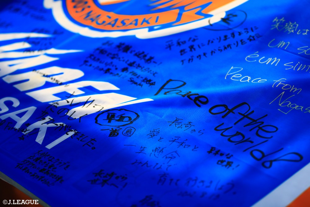 ファン・サポーターのみなさんからの平和のメッセージが記入されたフラッグと千羽鶴が贈呈され、試合前には黙祷を捧げました。