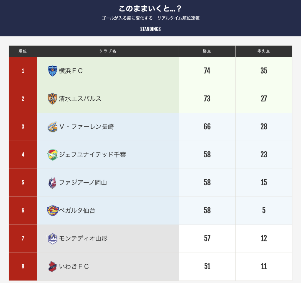 試合とあわせて、このリアルタイム順位表を見ながらで優勝・昇格・残留の行方を見届けましょう!