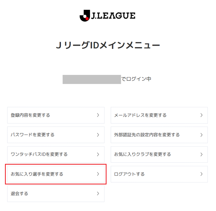 ②JリーグIDメインメニューの「お気に入り選手を変更する」をタップ