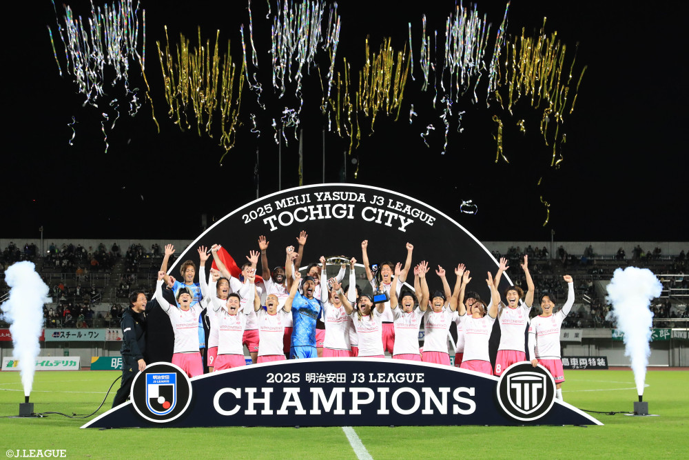 1947年に設立され、2019年から栃木シティフットボールクラブという名称で活動を開始。2023年に日本フットボールリーグ(JFL)への昇格を決めると、翌2024年にはJFLで優勝しJ3昇格を決めます。そして、今シーズンはJリーグ加盟1年目にしてJ3優勝とJ2昇格を決め、3年連続の昇格という快挙を成し遂げました!