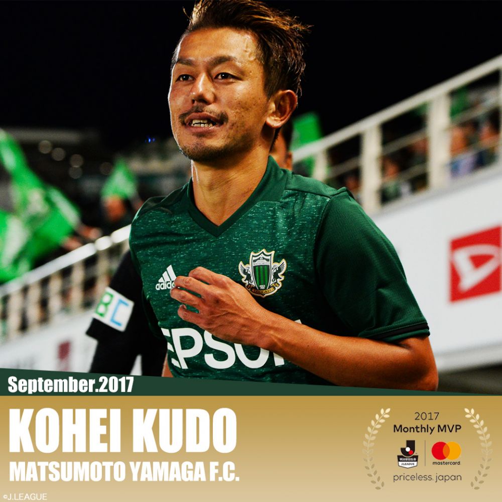 8位だった松本山雅FCが、第33節(9月16日)には4位に進出。チームの上がり調子を陰日向で支える工藤浩平選手に評価が集まり、9月の月間MVP受賞となった。攻撃では9月のチーム得点11得点の内、3ゴール1アシストの活躍。反町監督のサッカーを深く理解し、自身が得点できるだけでなく、味方を活かすプレーによってチームの総合力を高めた。スルーパス数は9月ではJ2で断トツ1位の活躍。成功率も高く、人を使うことができる選手が少ない中で、同選手は動く味方のタイミングを殺さずに活かすパスを出し、ゲームメイカーとして攻守にわたって活躍した点が高く評価された。